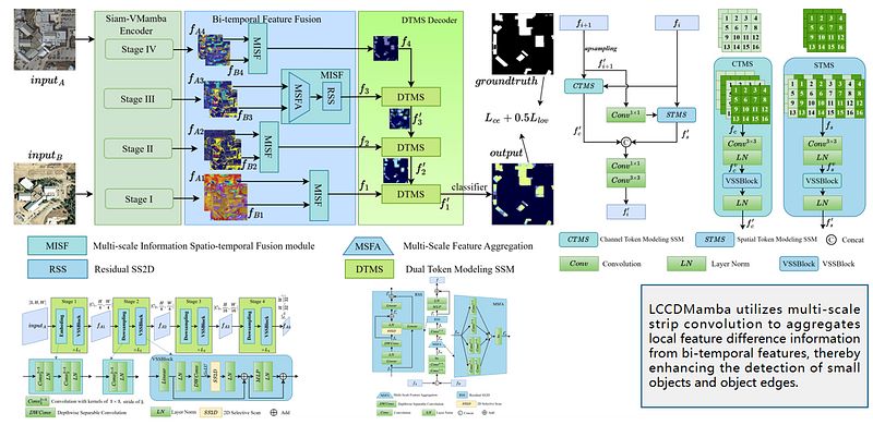 Abstract: Land cover change detection (LCCD) is a crucial research topic for rational planning of land use and facilitation of sustainable land resource growth. However, due to the complexity of LCCD tasks, integrating global and local features and fusing contextual information from remote sensing features are essential. Recently, with the advent of Mamba, which maintains linear time complexity and high efficiency in processing long-range data, it offers a new solution to address feature-fusion challenges in LCCD. Therefore, a novel visual state space model (SSM) for Land Cover Change Detection (LCCDMamba) is proposed, which uses Siam-VMamba as a backbone to extract multidimensional land cover features. To fuse the change information across difference temporal, multiscale information spatio-temporal fusion (MISF) module is designed to aggregate difference information from bitemporal features. The proposed MISF comprises multi-scale feature aggregation (MSFA), which utilizes strip convolution to aggregate multiscale local change information of bitemporal land cover features, and residual with SS2D (RSS) which employs residual structure with SS2D to capture global feature differences of bitemporal land cover features. To enhance the correlation of change features across different dimensions, in the decoder, we design a dual token modeling SSM (DTMS) through two token modeling approaches. This preserves high-dimensional semantic features and thus ensures that the multiscale change information across various dimensions will not be lost during feature restoration. Experiments have been conducted on WHU-CD, LEVIR-CD, and GVLM datasets, and the results demonstrate that LCCDMamba achieves F1 scores of 94.18%, 91.68%, and 87.14%, respectively, outperforming all the models compared.