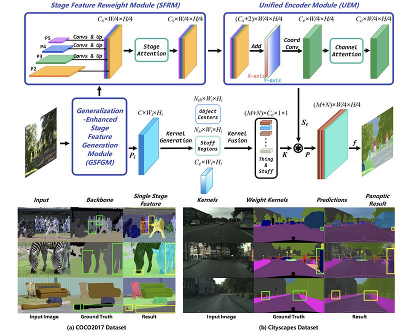 Abstract: Panoptic segmentation requires the prediction of a pixel-level mask with a category label in an image. In recent years, panoptic segmentation has been gaining more attention since it can help us understand objects and the environment in many fields, such as medical images, remote sensing images, and autonomous driving. However, existing panoptic segmentation methods are usually challenging for multi-scale object segmentation and boundary localization. In this paper, we propose a Polymerized Feature Panoptic Segmentation (PFPS) to enhance the network's feature representation ability by polymerizing the extracted stage features. Specifically, we propose a Generalization-Enhanced Stage Feature Generation Module (GSFGM) to extract and enhance the stage features. In the GSFGM, a novel Sampled and Concated Feature Generation (SCFG) is designed as an individual component, which polymerizes the convoluted backbone features to enhance multi-scale feature representation. Thereafter, we propose a Stage Feature Re-weight Module (SFRM) to ensure the network can learn efficient information from the massive channels. Moreover, we further propose a Unified Encoder Module (UEM) to provide spatial information and compress the high-dimensional features by coordinating convolution operations and channel attention. To demonstrate the superiority of the proposed PFPS, we conduct experiments on the COCO-2017 and the Cityscapes validation datasets. The experimental results indicate that the PFPS achieves a better performance in PQ of 43.0%, SQ of 80.4%, RQ of 51.9%, PQth of 48.6%, SQth of 82.6%, RQth of 58.1%, PQst of 34.6% on COCO-2017 validation dataset, while PQ of 61.7%, and PQst of 67.9% on Cityscapes validation dataset
