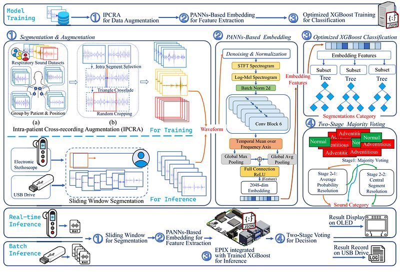 Abstract: Classifying respiratory sounds is essential for the early diagnosis of respiratory diseases. However, the computational cost of existing computer-aided respiratory sound analysis approaches limits their practical deployment in real-time clinical environments. This study presents embedded PANNs-based intelligent auscultation with XGBoost (EPIX), an intelligent embedded auscultation instrumentation system that integrates an electronic stethoscope interface, a PANNs-based acoustic feature extraction module, an optimized eXtreme gradient boosting (XGBoost) classifier, and a two-stage decision mechanism for reliable real-time respiratory sound classification and measurement. For hardware implementation, EPIX integrates a Raspberry Pi 5 and a dedicated expansion module, enabling real-time inference for electronic stethoscopes and batch inference through an external USB drive, providing flexible processing capabilities. EPIX achieved an SC score of 0.7618 on the SPRSound dataset, while significantly reducing computational resource requirements. These capabilities make EPIX well-suited for embedded measurement scenarios with limited computational resources. The processing workflow on the device provides consistent measurement performance and enables practical use in portable and bedside intelligent auscultation instruments.
